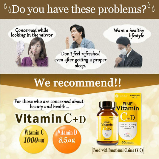 Vitamin C & D Supplement Capsules – 1000mg Vitamin C & 8.5μg Vitamin D (60 capsules) by FINE JAPAN